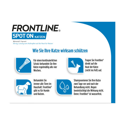Frontline Spot on Katze 50 mg, Lösung zum Auftropfen auf die Haut für Katzen Wirkstoff: Fipronil. Anwendungsgebiete: Zur Behandlung von Katzen gegen Floh-, Zecken- und Haarlingsbefall.
