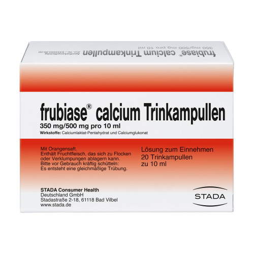 frubiase® calcium Trinkampullen. Anwendungsgebiete: Zur Vorbeugung eines Calciummangels bei erhöhtem Bedarf (z. B. Wachstumsalter, Schwangerschaft und Stillzeit), zur unterstützenden Behandlung der Osteoporose. Warnhinweise: Enthält Benzylakohol und Sorbitol. Enthält 1,49 mg Alkohol (Ethanol) pro Trinkampulle (10 ml).