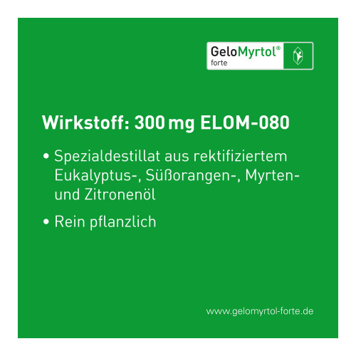 GeloMyrtol® forte 300 mg, magensaftresistente Weichkapseln. Anwendungsgebiete: Zur Schleimlösung und Erleichterung des Abhustens bei akuter und chronischer Bronchitis. Zur Schleimlösung bei Entzündungen der Nasennebenhöhlen (Sinusitis). Zur Anwendung bei Erwachsenen, Jugendlichen und Kindern ab 6 Jahren. Warnhinweis: Enthält Sorbitol.