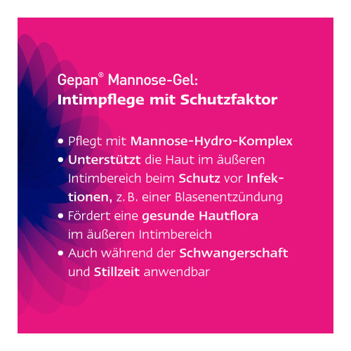 Das Gepan Mannose-Gel mit seinem Mannose-Hydro-Komplex eignet sich hierfür besonders gut: Zum einen besitzt das Gel hautpflegende und feuchtigkeitsspendende Eigenschaften. Zum anderen bietet es Unterstützung beim Schutz gegen Keime und damit auch vor Infektionen z. B. einer Blasenentzündung. So trägt das Gepan Mannose-Gel sowohl zur Stärkung und Pflege der Haut im äußeren Intimbereich als auch zur Keimprävention bei.
