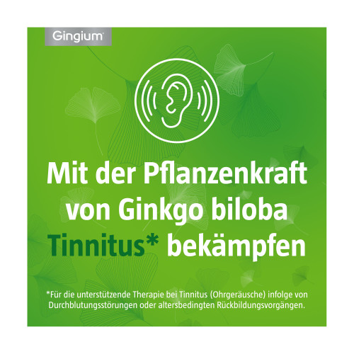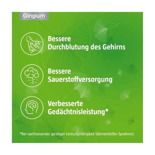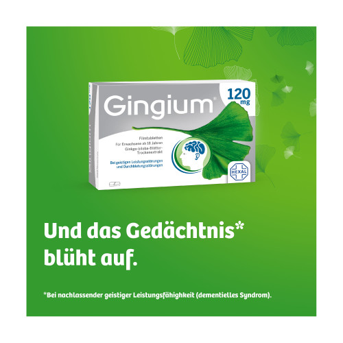 Gingium® 120 mg Filmtabletten. Wirkstoff: Ginkgo-biloba-Blätter-Trockenextrakt. Anwendungsgebiete: Zur symptomatischen Behandlung von hirnorganisch bedingten geistigen Leistungseinbußen im Rahmen eines therapeutischen Gesamtkonzeptes bei Abnahme bzw. Verlust erworbener geistiger Fähigkeiten (dementiellen Syndromen) mit den Hauptbeschwerden: Gedächtnisstörungen, Konzentrationsstörungen, Niedergeschlagenheit, Schwindel, Ohrensausen, Kopfschmerzen. Das individuelle Ansprechen auf die Medikation kann nicht vorausgesagt werden. Bevor die Behandlung mit diesem Arzneimittel begonnen wird, sollte geklärt werden, ob die Krankheitszeichen nicht auf einer spezifisch zu behandelnden Grunderkrankung beruhen. Zur Verlängerung der schmerzfreien Gehstrecke bei arterieller Verschlusskrankheit in den Gliedmaßen, sog. „Schaufensterkrankheit“ (Claudicatio intermittens im Stadium II nach FONTAINE) im Rahmen physikalisch-therapeutischer Maßnahmen, insbesondere Gehtraining. Bei Schwindel infolge von Durchblutungsstörungen oder altersbedingten Rückbildungsvorgängen (Vertigo vaskulärer und involutiver Genese). Zur unterstützenden Behandlung von Ohrgeräuschen infolge von Durchblutungsstörungen oder altersbedingten Rückbildungsvorgängen (Tinnitus vaskulärer und involutiver Genese). Häufig auftretende Schwindelgefühle und Ohrensausen bedürfen grundsätzlich der Abklärung durch einen Arzt. Bei plötzlich auftretender Schwerhörigkeit bzw. einem Hörverlust sollte unverzüglich ein Arzt aufgesucht werden. Warnhinweis: Enthält Glucose und Lactose.