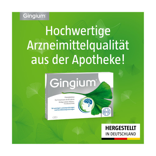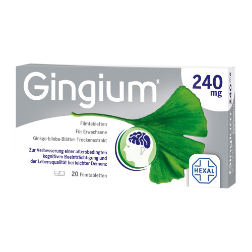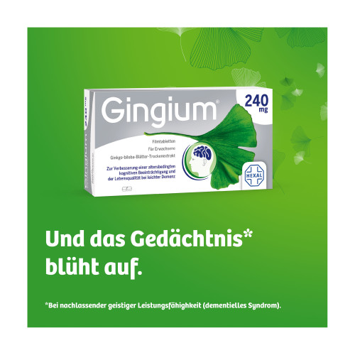 Gingium® 240 mg Filmtabletten. Wirkstoff: Ginkgo-biloba-Blätter-Trockenextrakt. Anwendungsgebiete: Pflanzliches Arzneimittel zur Verbesserung einer altersbedingten kognitiven Beeinträchtigung und der Lebensqualität bei leichter Demenz. Warnhinweis: Enthält Lactose und Glucose.