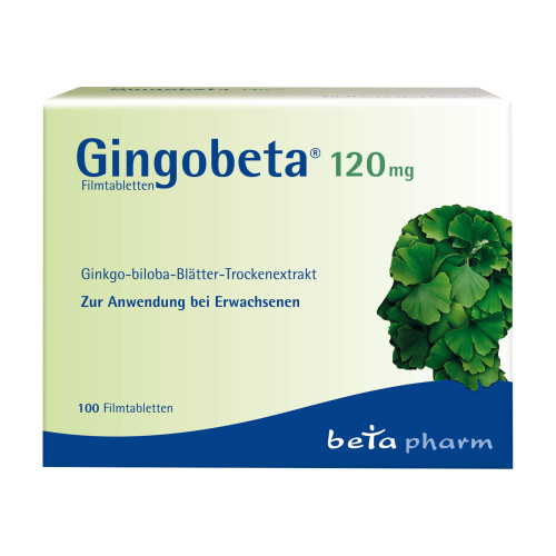 Gingobeta® 120 mg Filmtabletten. Wirkstoff: Ginkgo-biloba-Blätter Trockenextrakt. Anwendungsgebiete: Pflanzliches Arzneimittel zur Verbesserung einer altersbedingten kognitiven Beeinträchtigung und der Lebensqualität bei leichter Demenz. Warnhinweis: Enthält Lactose und Glucose.