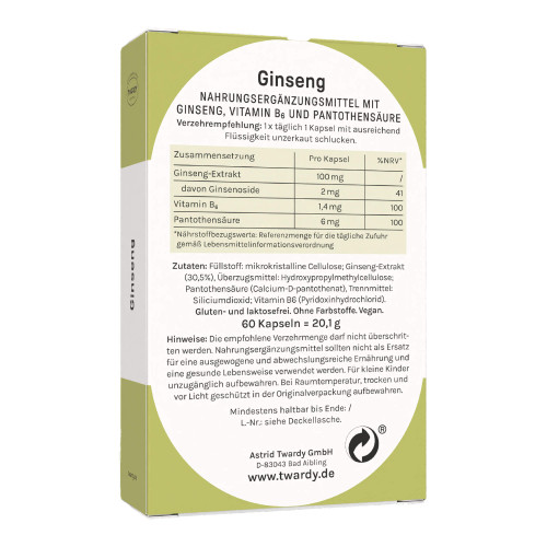 Twardy Ginseng Kapseln enthalten einen Extrakt aus Panax Ginseng. Sie sind vegan und mit Vitamin B6 und Pantothensäure angereichert. Vitamin B6 unterstützt das Nervensystem und kann Müdigkeit und Erschöpfung vermindern, Pantothensäure zählt auch zu den B-Vitaminen und spielt ebenfalls eine wichtige Rolle im Energiestoffwechsel.