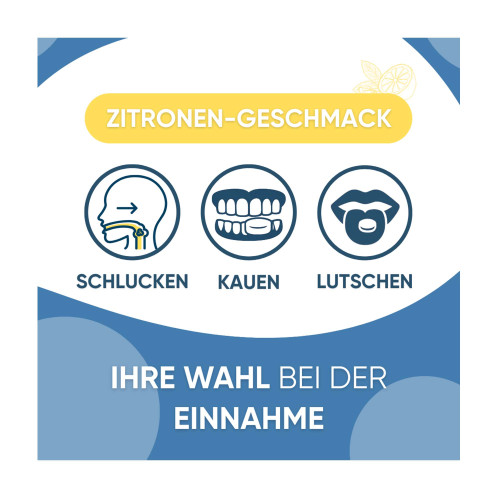 Nehmen Sie das Arzneimittel mit Flüssigkeit (z.B. 1 Glas Wasser) ein. Oder: Lutschen Sie das Arzneimittel langsam. Oder: Kauen Sie das Arzneimittel gut.