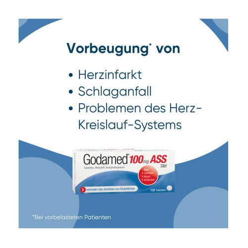 Godamed 100 mg ASS TAH Tabletten. Wirkstoff: Acetylsalicylsäure. Anwendungsgebiete: Instabile Angina pectoris – als Teil der Standardtherapie Akuter Myokardinfarkt – als Teil der Standardtherapie Reinfarktprophylaxe. Nach arteriellen gefäßchirurgischen oder interventionellen Eingriffen (z.B. nach ACVB, bei PTCA). Vorbeugung von TIA und Hirninfarkten, nachdem Vorläuferstadien aufgetreten sind. Warnhinweis: Godamed 100 mg ASS TAH eignet sich nicht zur Behandlung von Schmerzzuständen.