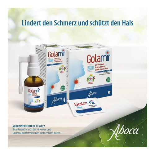 Golamir 2Act lindert Schmerzen und Entzündungen, indem die Schleimhaut im Mund- und Rachenraum geschützt wird.