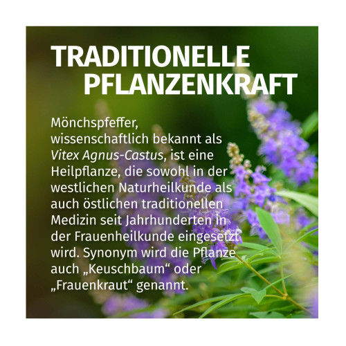 da sie bei verschiedenen weiblichen Gesundheitsbeschwerden verwendet werden kann. Die Heilkraft von Mönchspfeffer wurde bereits in der Antike beschrieben und wird hauptsächlich auf seine Fähigkeit zur Regulation des Hormonhaushalts zurückgeführt. Mönchspfeffer ist ein vielseitiger Allrounder für das weibliche Wohlbefinden. Die Pflanze enthält hochwertige Inhaltsstoffe: ätherische Öle (mit Sabinen, Cineol und Alpha-Pinen), Iridoidglykoside (Aucubin und Agnusid) und weitere Pflanzenstoffe, wie Diterpene, Flavonoide und Gerbstoffe. Besonders die Iridoidglykoside können regulierend auf den Hormonhaushalt.