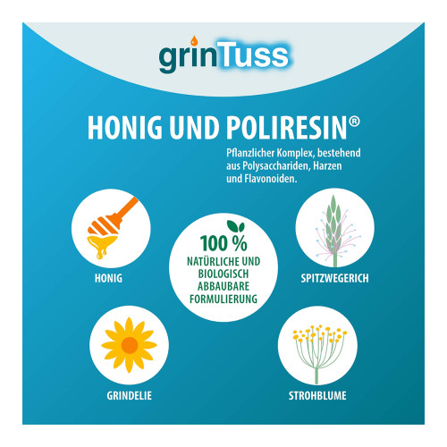 Grintuss Erwachsene Hustensaft ist ein zu 100% natürliches Produkt auf Basis von Honig und dem pflanzlichen Molekülkomplex Poliresin®. Dank seiner physiologischen Wirkung schützt er die oberen Atemwege und lindert deren Reizung. Grintuss ist ohne Alkohol und glutenfrei mit einem angenehmen Geschmack. Seine Inhaltstoffe stammen dabei aus nachhaltigem und biologischem Anbau.