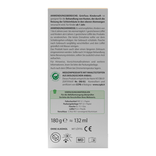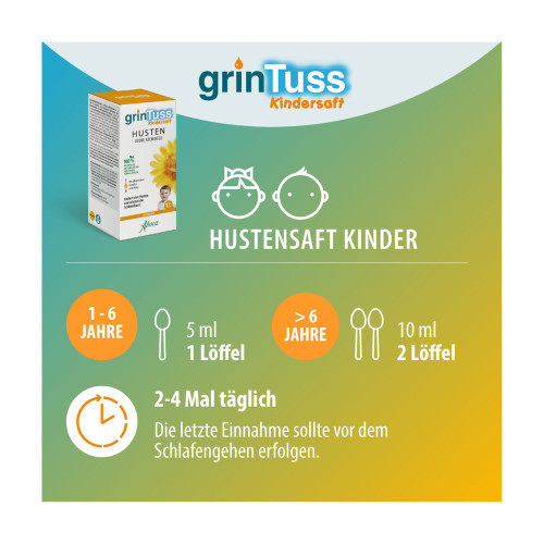 Grintuss Kindersaft ist für die Behandlung von Husten geeignet, welcher auf die Reizung der Schleimhaut in den oberen Atemwegen zurückzuführen ist. Geeignet für Kindern ab 1 Jahr.