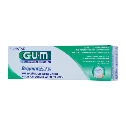 Das GUM Original White Sortiment wurde entwickelt, um das natürliche Weiß der Zähne wieder herzustellen. Es entfernt nicht nur effektiv Verfärbungen, sondern schützt auch vor neuen Verfärbungen. Ideal für den täglichen Gebrauch. Hoch reinigungsaktive Mikro-Kieselerde-Perlen und größere Silica-Partikel entfernen Verfärbungen effektiv (physikalisch). Das StainClear-System löst Verfärbungen auf und beugt Neubildungen vor. Die Kombination aus 1490 ppm Fluorid aus Natriumfluorid und Isomalt sorgt für eine verbesserte Remineralisation. Vitamin E und Provitamin B5 beruhigen und revitalisieren das Zahnfleisch.