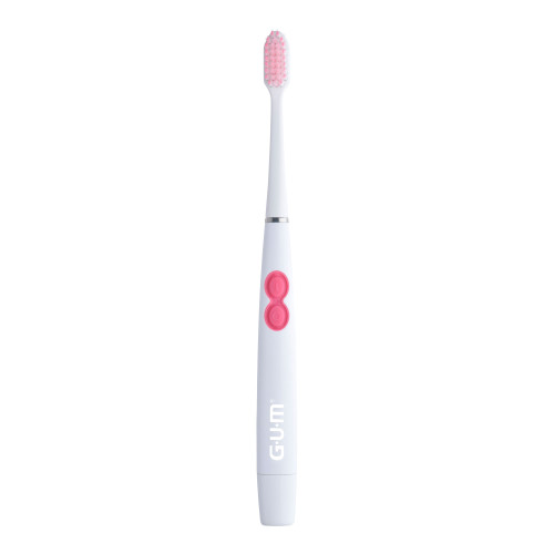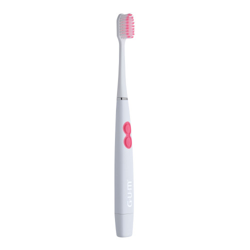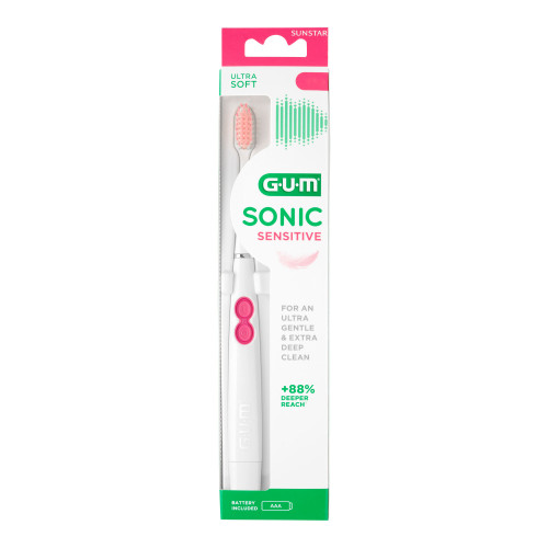 Die GUM SONIC SENSITIVE batteriebetriebenen Zahnbürste bietet eine super-sanfte, extra tiefe Reinigung für schmerzempfindliche Zähne und empfindliches Zahnfleisch. Schallvibrationen helfen Ihnen, Zahnbelag (Plaque) mit wenig Aufwand effektiv zu entfernen. Mit ultraweichen, beidseitig spitz zulaufenden Borsten können Sie mit dieser Bürste unter dem Zahnfleischrand und zwischen den Zähnen reinigen. Es ist erwiesen, dass Plaque (Zahnbelag) in schwer zugänglichen Bereichen 88% tiefer entfernt wird als bei einer Sensitive-Zahnbürste mit planem Borstenfeld. Unsere batteriebetriebene Zahnbürste bietet ein super-sanftes Putzerlebnis, massiert das Zahnfleisch und lässt Sie sich frisch und sauber fühlen. Für optimale Ergebnisse empfehlen wir die Verwendung mit der GUM SensiVital+® Zahnpasta und Mundspülung.