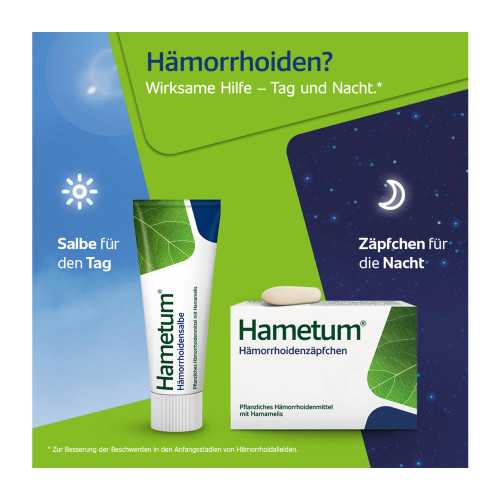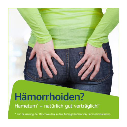 Hametum® Hämorrhoidenzäpfchen. Wirkstoff: Hamamelisblätter-Auszug. Anwendungsgebiete: Bei Juckreiz, Brennen und leichte Blutungen in den Anfangsstadien von Hämorrhoidalleiden.