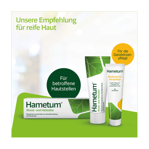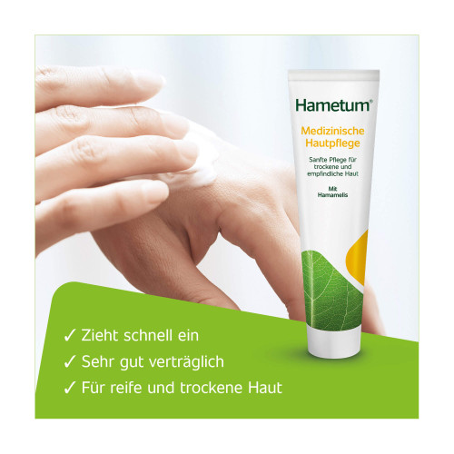 Das Kosmetikum Hametum® medizinische Hautpflege ist eine Creme, die bei empfindlicher reifer Haut zweifach hilft: Die feuchtigkeitsspendende, intensiv pflegende Creme Grundlage und das entzündungshemmende Hamamelis-Destillat beruhigen die Haut. Sie unterstützen damit die Regeneration der oberen Hautschicht.