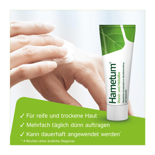 Hametum® Wund- und Heilsalbe. Wirkstoff: Hamamelisdestillat. Anwendungsgebiete: Bei leichten Hautverletzungen, kleinflächigen Entzündungen der Haut und Schleimhäute. Warnhinweis: Enthält Wollwachs, Butylhydroxytoluol, Cetylstearylalkohol und Propylenglycol.
