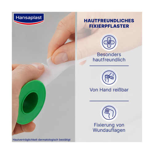 Das hypoallergene Fixierpflaster ist besonders für empfindliche und sensible Haut geeignet und leicht von Hand reißbar.