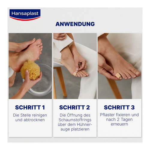 Bringen Sie das Pflaster auf, indem Sie die Öffnung des Schaumstoffrings direkt über dem Hühnerauge platzieren. Nach 2 Tagen sollte das Pflaster erneuert werden, nach 4 Tagen kann der erweichte Hornhautzapfen in einem warmen Seifen- oder Kochsalzbad entfernt werden. Wenn nötig, kann die Behandlung wiederholt werden.