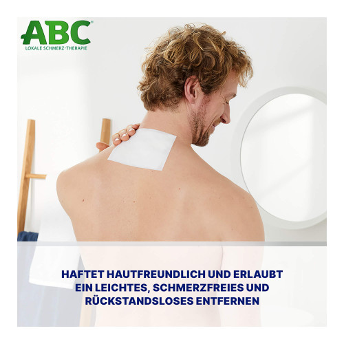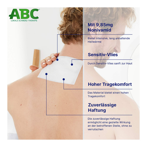 ABC Wärme-Pflaster mit Sensitiv-Vlies für Erwachsene ab 18 Jahren. Wirkstoff: Nonivamid. Anwendungsgebiete: Zur äußerlichen symptomatischen Behandlung von Schmerzen der Muskel im Bereich der Lendenwirbelsäule und der Nackenmuskulatur. Warnhinweise: Enthält Methyl-4-hydroxybenzoat und Propylenglykol.