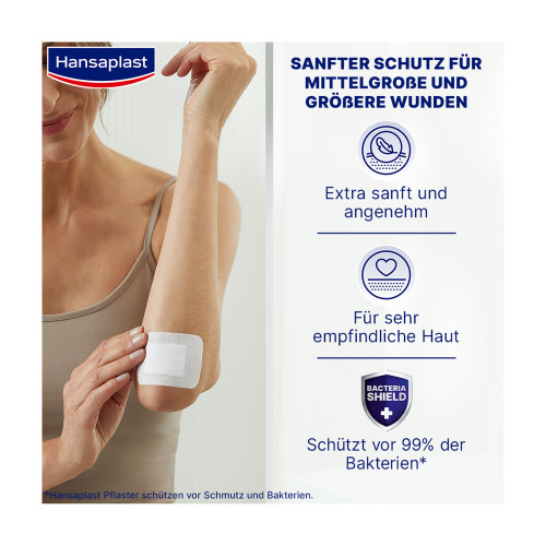 Der Wundverbande Hansaplast Ultra Sensitive XL ist ein sanft haftende Silikonpflaster für die Versorgung mittelgroßer und größerer Wunden, wie sie im Alltag entstehen können. Es ist geeignet bei sehr empfindlicher Haut.