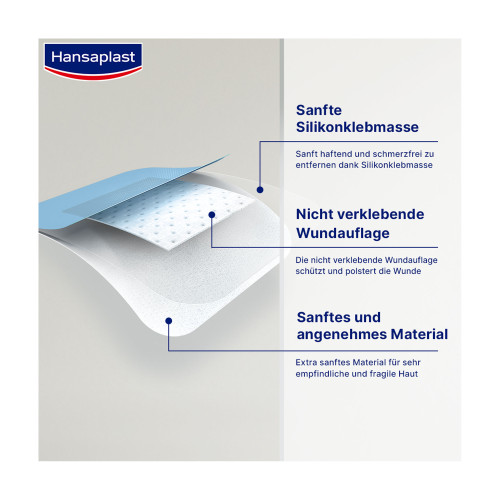 Der Wundverband Hansaplast Ultra Sensitive XXL ist ein sanft haftendes Silikonpflaster für die Versorgung mittelgroßer und größerer Wunden, wie sie im Alltag entstehen können. Es ist geeignet bei sehr empfindlicher Haut.