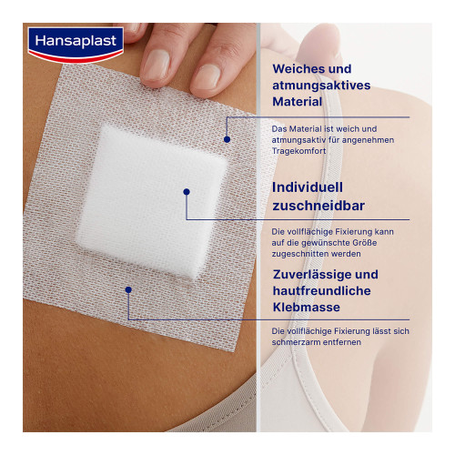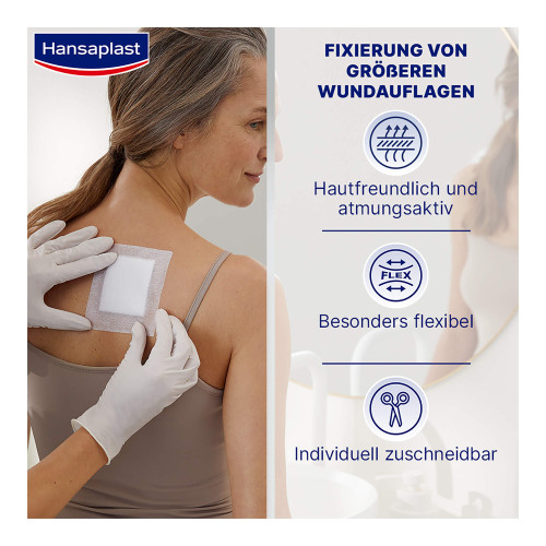 Mit Hansaplast Vollflächige Fixierung können Wundauflagen oder Kompressen einfach und sicher fixiert werden, um Wunden vor Bakterien und Schmutz zu schützen. Das Trägermaterial besteht aus einem weichen, flexiblen Vlies und bietet angenehmen Tragekomfort, besonders bei der Wundversorgung von größeren Körperflächen am Rücken und Bauch oder an Gelenken.