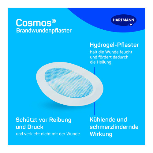 Cosmos Brandwundenpflaster fördern die Wundheilung bei Brandwunden. Das Hydrogel-Wundkissen sorgt für ein ausgewogen feuchtes Wundmilieu und fördert dadurch die Wundheilung. Zudem schützt das Brandwundenpflaster vor Reibung und Druck. Dank seines kühlenden Effektes auf der Haut hat cosmos Brandwundenpflaster schmerzlindernde Eigenschaften.
