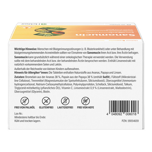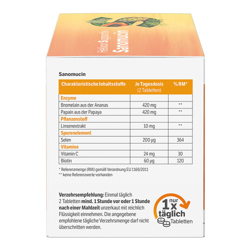 Mit dem Nahrungsergänzungsmittel Sanomucin können Sie Ihrem Körper zusätzlich zu einer ausgewogenen Ernährung wertvolle pflanzliche Enzyme und Mikronährstoffe zuführen. Sanomucin Tabletten enthalten die wertvollen pflanzlichen Enzyme Bromelain (aus der Ananas) und Papain (aus der Papaya), Linsenextrakt mit natürlich vorkommendem Selen und Lektin sowie die für den Körper wichtigen Nährstoffe Vitamin C und Biotin, welches zur Erhaltung normaler Schleimhäute beiträgt.