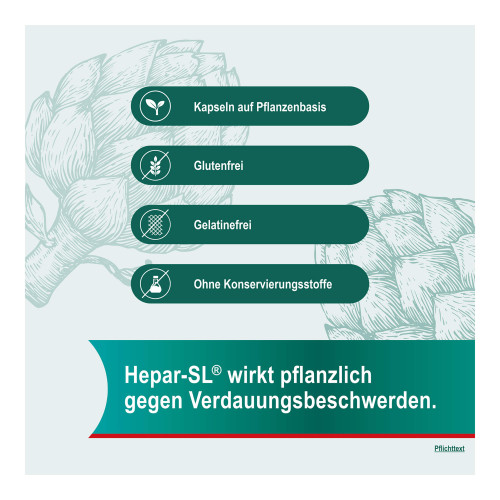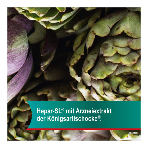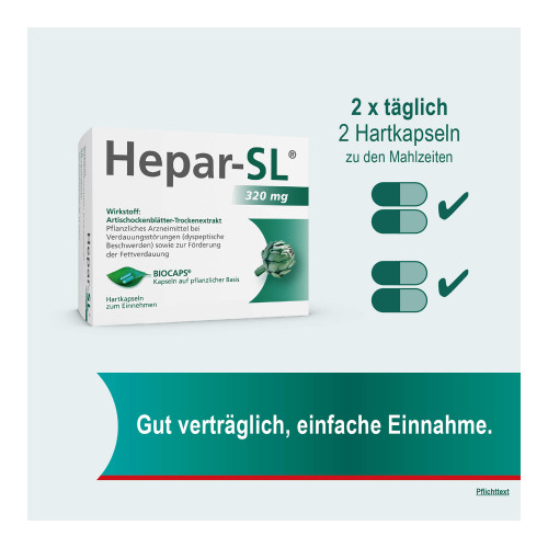 Hepar-SL 20 mg Hartkapseln. Wirkstoff: Artischockenblätter-Trockenextrakt. Anwendungsgebiete: Hepar-SL 320 mg wird angewendet bei Verdauungsstörungen (dyspeptischen Beschwerden), besonders bei funktionellen Störungen des ableitenden Gallensystems. Hinweis: Dieses Arzneimittel enthält Lactose.