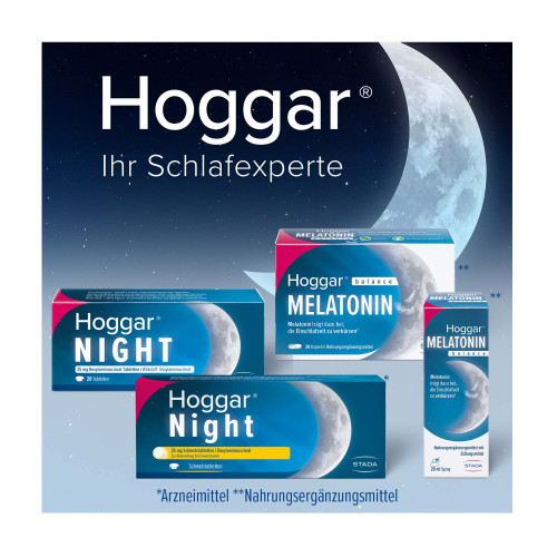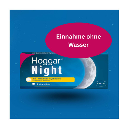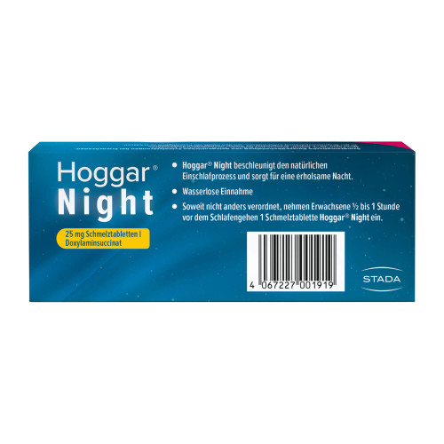 Hoggar Night 25 mg Schmelztabletten. Wirkstoff: Doxylaminhydrogensuccinat. Anwendungsgebiete: Zur Anwendung bei Erwachsenen. Zur symptomatischen Kurzzeitbehandlung von gelegentlichen Schlafstörungen bei Erwachsenen. Warnhinweise: Nicht alle Schlafstörungen bedürfen einer medikamentösen The-rapie. Oftmals sind sie Ausdruck körperlicher oder seelischer Erkrankungen und können durch andere Maßnahmen oder eine Therapie der Grundkrankheit beeinflusst werden. Deshalb sollte Hoggar® Night nicht zur Dauerbehandlung von länger anhaltenden Schlaf-störungen angewendet werden. Suchen Sie stattdessen Ihren behandelnden Arzt auf. Hinweis: Enthält Glucose und Natrium.