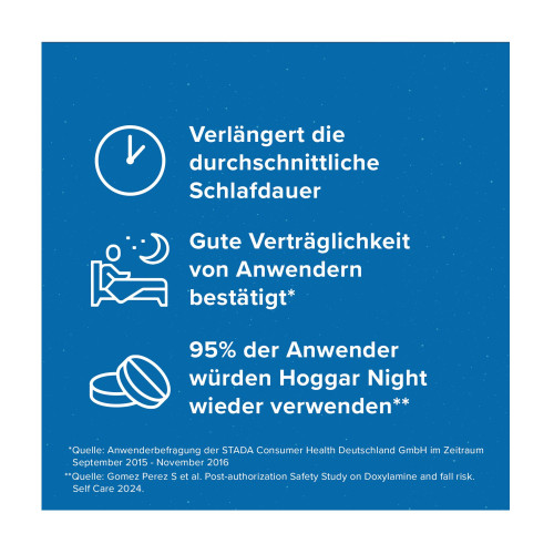 Nicht alle Schlafstörungen bedürfen einer medikamentösen Therapie. Oftmals sind sie Ausdruck körperlicher oder seelischer Erkrankungen und können durch andere Maßnahmen oder eine Therapie der Grundkrankheit beeinflusst werden. Deshalb sollte Hoggar® Night nicht zur Dauerbehandlung von länger anhaltenden Schlafstörungen angewendet werden.