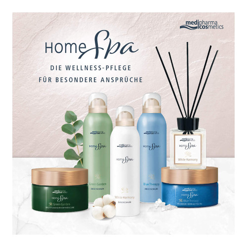 Im Anschluss verleiht der Home Spa Green Garden Körperbalsam (PZN 18677996) Ihrer Haut ein seidiges Finish. Beim Auftragen schmilzt er zart auf der Haut und hüllt sie ein in seinen intensiv cremigen Duft. Er pflegt sanft Ihre Haut mit Sheabutter, Panthenol und Bio-Eukalyptus-Extrakt.