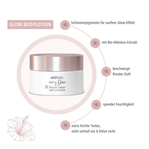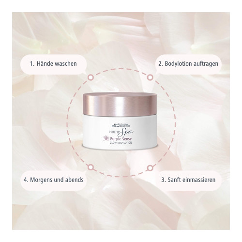 Die medipharma cosmetics Home Spa Purple Sense Glow Bodylotion pflegt die Haut mit Glycerin, feuchtigkeitsspendender Hyaluronsäure und Bio-Hibiskus-Extrakt für ein sinnliches Spa-Erlebnis im eigenen Zuhause.