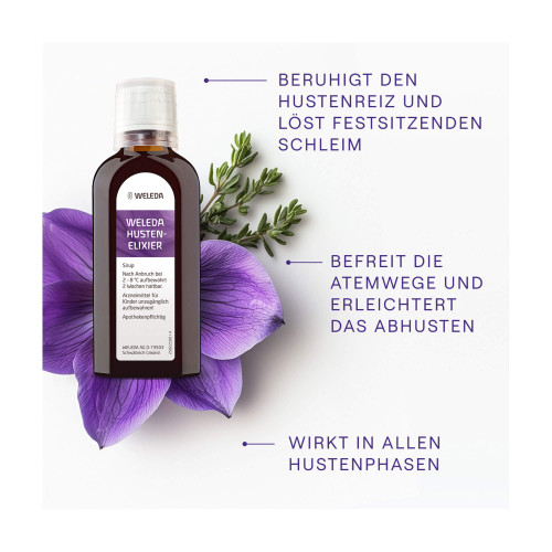 Weleda Hustenelixier Sirup. Anwendungsgebiete: Gemäß der anthroposophischen Menschen- und Naturerkenntnis. Dazu gehören: Akute katarrhalische Entzündungen der Luftwege; zur Förderung des Abhustens von zähem Schleim und zur Linderung des Hustenreizes. Warnhinweise: Enthält Sucrose.
