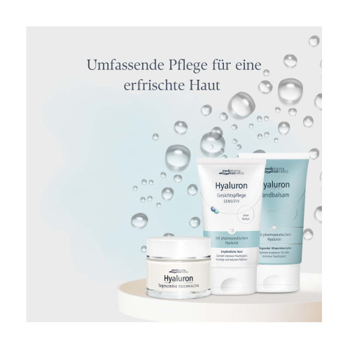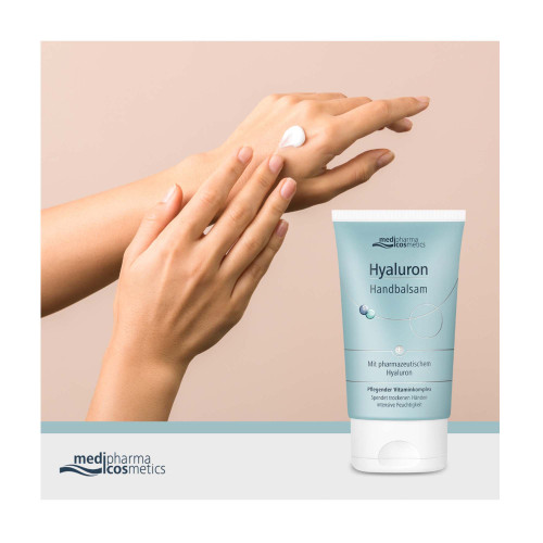 Der Hyaluron Handbalsam von medipharma cosmetics wurde speziell für die Bedürfnisse trockener und empfindlicher Haut entwickelt. Die vegane Formulierung enthält pharmazeutisches Hyaluron, Biotin, Vitamin A und Provitamin B5 – eine wirkungsvolle Kombination, die die Haut intensiv mit Feuchtigkeit versorgt, die Regeneration unterstützt und die Hautstruktur glätten kann. Auch spröde Nagelhaut wird gepflegt und geschmeidig gehalten.
