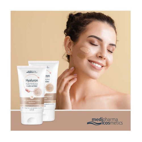 Ein ebenmäßiger, frischer Teint – ganz ohne schweres Make-up: Das Hyaluron Nude Perfection Getönte Fluid von medipharma cosmetics vereint hautbildkorrigierende Tönung mit intensiver Feuchtigkeitspflege – für ein natürlich gepflegtes Finish mit Sofort-Effekt.