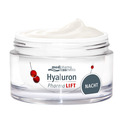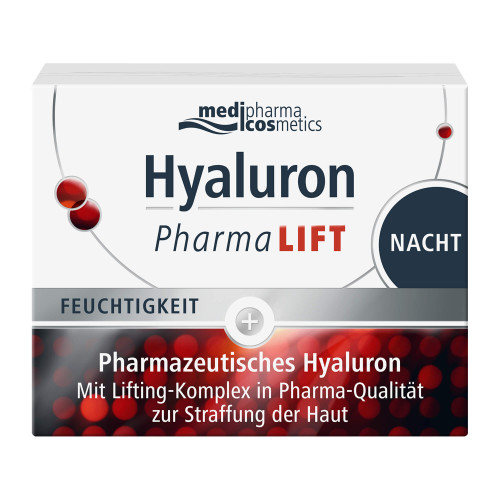 Hyaluron Pharma LIFT Nacht wirkt dem Prozess der Faltenbildung mit einem Lifting-Komplex und Hyaluronsäure in Pharma-Qualität entgegen. Die Haut wird gestrafft, intensiv gepflegt und mit Feuchtigkeit versorgt. Spannkraft und Elastizität der Haut werden verbessert. Die leichte Textur mit Vitamin E reduziert Falten, regeneriert die Haut über Nacht und sorgt für jünger aussehende, glattere und strahlende Haut am Morgen.