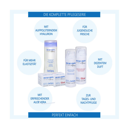 Die Hyaluron proYoung Faltenfiller Nachtcreme zeichnet sich durch die ausgewogene Kombination von Hyaluronsäure, Aloe Vera und Retinol aus. Die Haut wird über Nacht entspannt, regeneriert und optimal gepflegt. Die reichhaltige Creme pflegt die Gesichtshaut während der Nacht intensiv und garantiert ein strahlendes Erwachen am nächsten Morgen. Mit der Verbesserung der Hautstruktur wird auch die gesunde Kollagenproduktion angeregt – diese sorgt für eine straffere Haut.