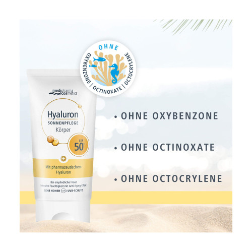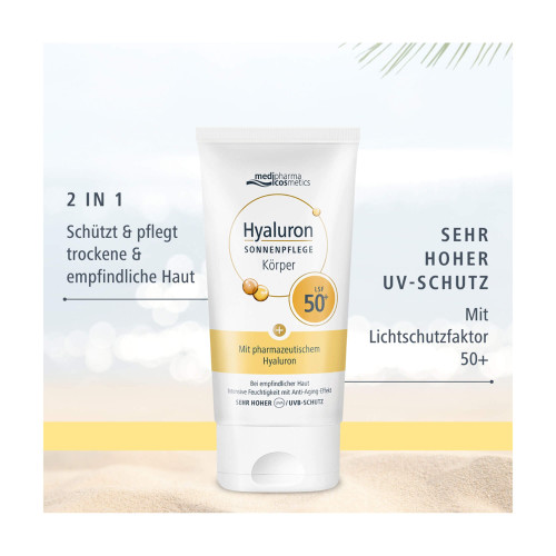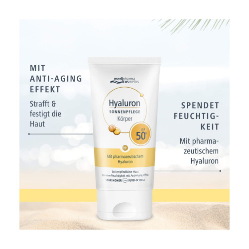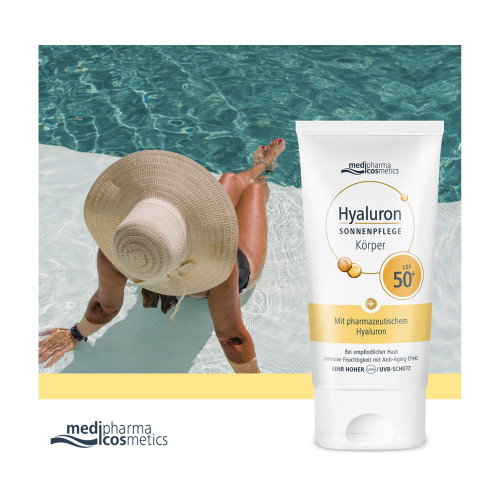Die Hyaluron Sonnenpflege Körper LSF 50+ von medipharma cosmetics bietet auch empfindlichen Hauttypen sehr hohe Sicherheit und Hautschutz bei intensiver Sonneneinstrahlung. Der enthaltene Wirkkomplex mit Hyaluronsäure in pharmazeutischer Qualität und Anti-Aging-Effekt gleicht den Feuchtigkeitsverlust der Haut ideal aus, strafft und festigt die Körpersilhouette.