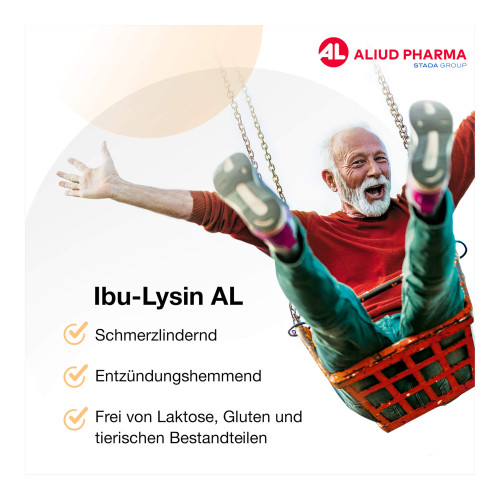 Ibu-Lysin AL 400 mg Filmtabletten. Wirkstoff: Ibuprofen (als Ibuprofen-DL-Lysin (1:1)). Anwendungsgebiete: Zur Anwendung bei Erwachsenen und Jugendlichen ab 40 kg Körpergewicht (ab 12 Jahren). Zur kurzzeitigen symptomatischen Behandlung von leichten bis mäßig starken Schmerzen wie Kopfschmerzen, Zahnschmerzen und Regelschmerzen und/oder Fieber. Warnhinweis: Bei Schmerzen oder Fieber ohne ärztlichen Rat nicht länger anwenden als in der Packungsbeilage vorgegeben!
