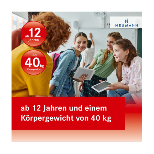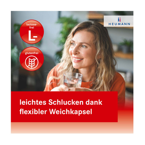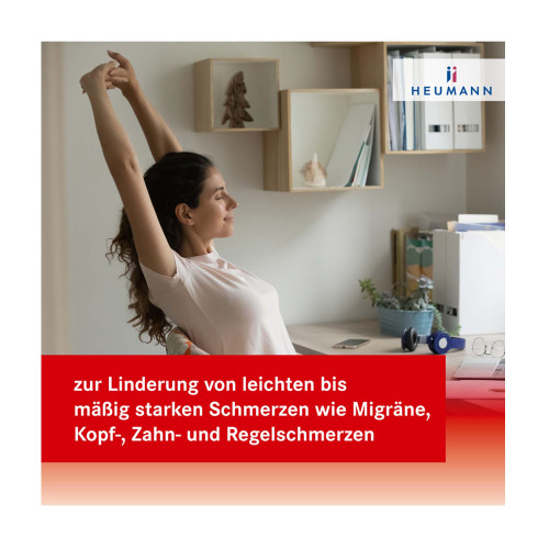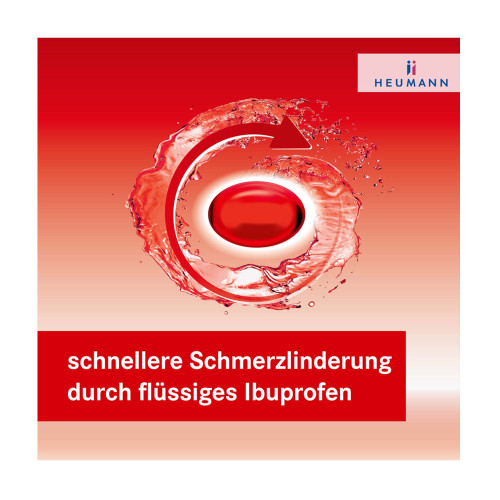 Ibuprofen HEUMANN 400 mg Weichkapseln. Anwendungsgebiete: Für Erwachsene und Jugendliche ab 40 kg Körpergewicht (ab 12 Jahren). Zur kurzzeitigen symptomatischen Behandlung von leichten bis mäßig starken Schmerzen wie Kopfschmerzen, Regelschmerzen, Zahnschmerzen, der akuten Kopfschmerzphase bei Migräne mit oder ohne Aura sowie Fieber. Warnhinweise: Bei Schmerzen oder Fieber ohne ärztlichen Rat nicht länger anwenden als in der Packungsbeilage vorgegeben! Enthält Sorbitol und Phospholipide aus Sojabohnen.