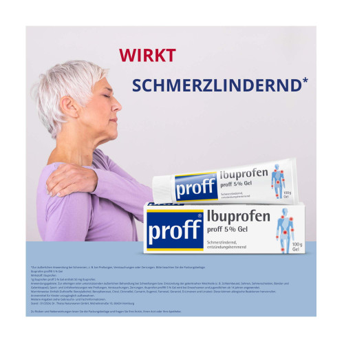 Ibuprofen proff 5% Gel. Anwendungsgebiete: Zur alleinigen oder unterstützenden äußerlichen Behandlung bei Schwellungen bzw. Entzündung der gelenknahen Weichteile (z. B. Schleimbeutel, Sehnen, Sehnenscheiden, Bänder und Gelenkkapsel), Sport- und Unfallverletzungen wie Prellungen, Verstauchungen, Zerrungen. Ibuprofen proff® 5 % Gel wird bei Erwachsenen und Jugendlichen ab 14 Jahren angewendet. Warnhinweise: Enthält Duftstoffe: Benzylalkohol, Benzylbenzoat, Citral, Citronellol, Cumarin, Eugenol, Farnesol, Geraniol, D-Limonen und Linalool. Diese können allergische Reaktionen hervorrufen.