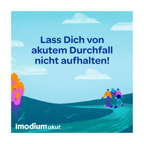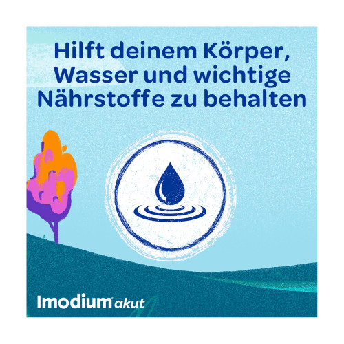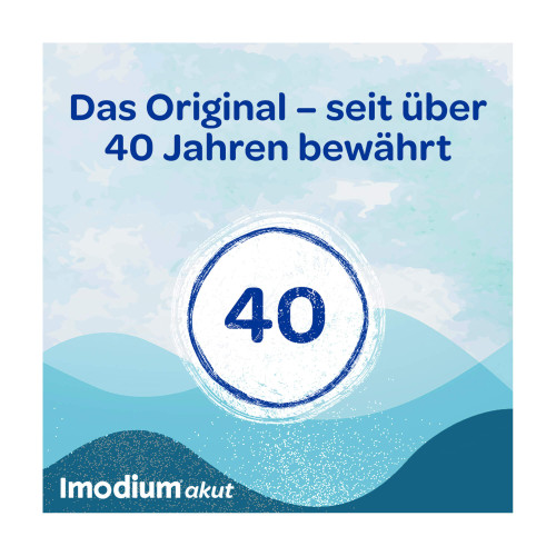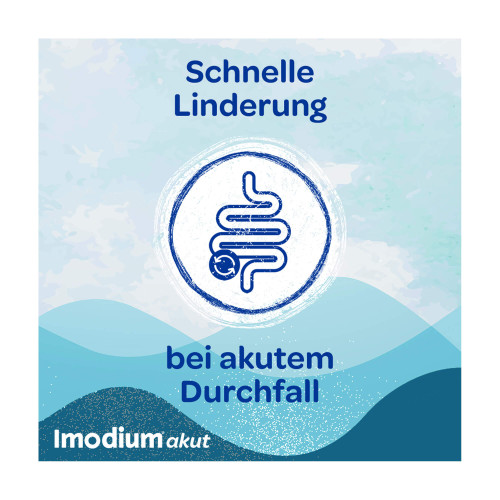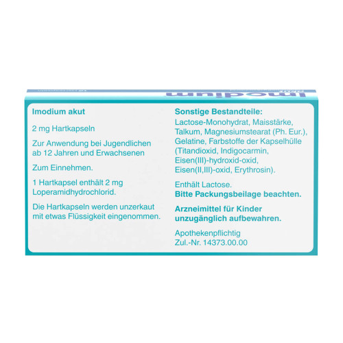 Imodium akut. Wirkstoff: Loperamidhydrochlorid. Anwendungsgebiet: Symptomatische Behandlung von akuten Durchfällen für Erwachsene und Jugendliche ab 12 Jahren, sofern keine ursächliche Therapie zur Verfügung steht. Eine über 2 Tage hinausgehende Behandlung nur unter ärztlicher Verordnung und Verlaufsbeobachtung. Warnhinweise: Enthält Lactose.