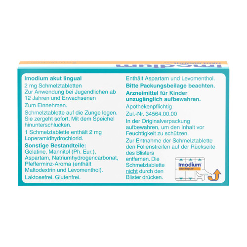 Imodium® akut lingual. Wirkstoff: Loperamidhydrochlorid. Anwendungsgebiet: Symptomatische Behandlung von akuten Durchfällen für Erwachsene und Jugendliche ab 12 Jahren, sofern keine ursächliche Therapie zur Verfügung steht. Eine über 2 Tage hinausgehende Behandlung nur unter ärztlicher Verordnung und Verlaufsbeobachtung. Warnhinweise: Enthält Aspartam, Pfefferminz-Aroma (Benzylalkohol, Levomenthol, Glukose und Spuren von Sulfiten).