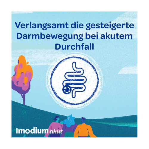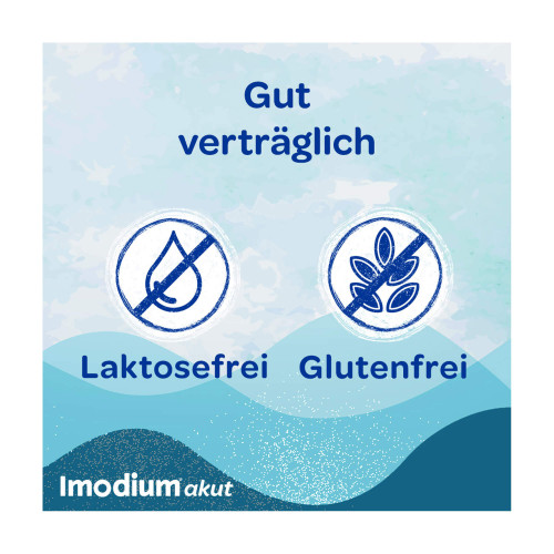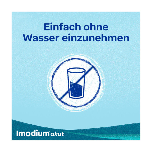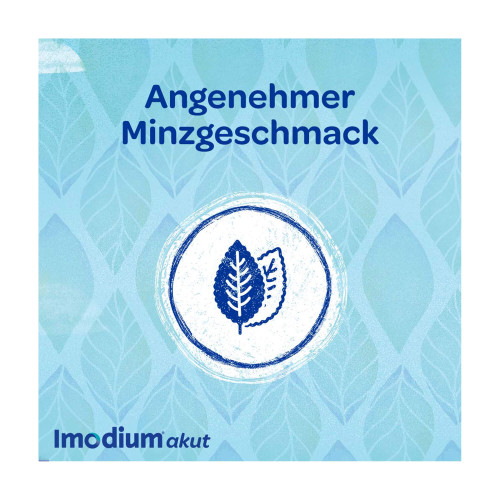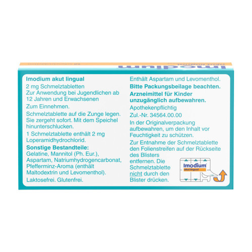 Imodium® akut lingual. Wirkstoff: Loperamidhydrochlorid. Anwendungsgebiet: Symptomatische Behandlung von akuten Durchfällen für Erwachsene und Jugendliche ab 12 Jahren, sofern keine ursächliche Therapie zur Verfügung steht. Eine über 2 Tage hinausgehende Behandlung nur unter ärztlicher Verordnung und Verlaufsbeobachtung. Warnhinweise: Enthält Aspartam, Pfefferminz-Aroma (Benzylalkohol, Levomenthol, Glukose und Spuren von Sulfiten).