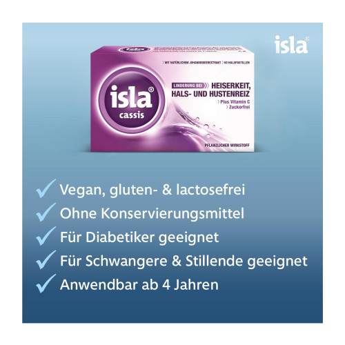 Die Inhaltsstoffe von isla® cassis legen sich wie Balsam über die Schleimhaut in Hals und Rachen. So wird die gereizte Schleimhaut vor weiteren Angriffen geschützt und kann sich durch die wohltuende Wirkung schneller erholen, insbesondere bei Beschwerden im Hals durch