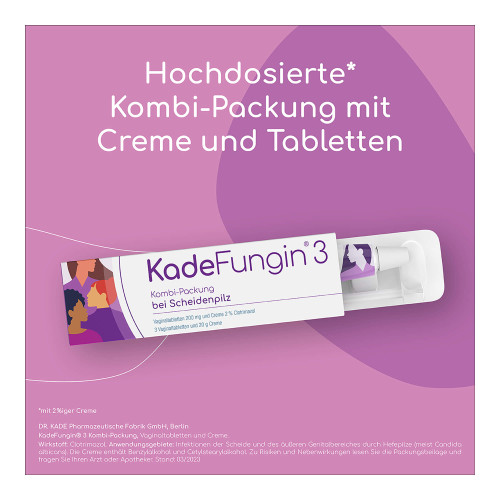 KadeFungin® 3 Kombi-Packung, Vaginaltabletten und Creme. Wirkstoff: Clotrimazol. Anwendungsgebiete: Infektionen der Scheide und des äußeren Genitalbereiches durch Hefepilze (meist Candida albicans). Warnhinweis: Enthält Benzylalkohol und Cetylstearylalkohol.