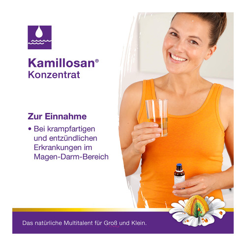 Kamillosan Konzentrat ist ein pflanzliches Arzneimittel zur Anwendung bei Magen-Darm-Beschwerden, bei Entzündungen im Mund- und Rachenraum, bei katarrhalischen Erkrankungen der oberen Atemwege sowie zur äußerlichen Anwendung bei entzündlichen Hautveränderungen.