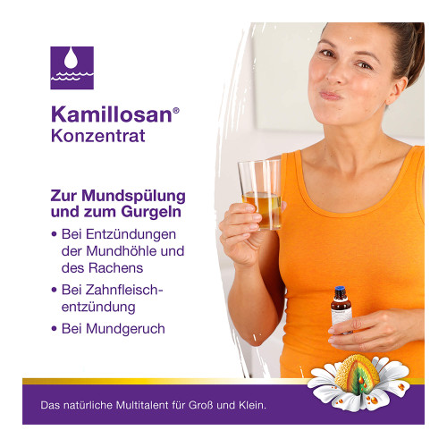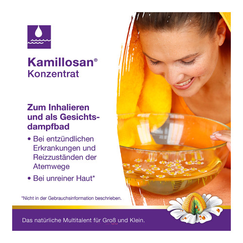 Kamillosan Konzentrat, Flüssigkeit. Anwendungsgebiete: Zur Inhalation bei entzündlichen Erkrankungen und Reizzuständen der Atemwege; als Zusatz für feuchte Umschläge, Spülungen oder Waschungen bei entzündlichen Haut- und Schleimhauterkrankungen einschließlich der Mundhöhle und des Zahnfleisches; als Zusatz zu Teil-und Sitzbädern oder Spülungen bei Entzündungen im Analbereich und im Bereich der Geschlechtsorgane; zum Einnehmen bei krampfartigen und entzündlichen Erkrankungen im Magen-Darm-Bereich. Warnhinweise: Enthält 42,8 Vol.-% Alkohol, Macrogolglycerolhydroxystearat und 1 mmol Natrium.