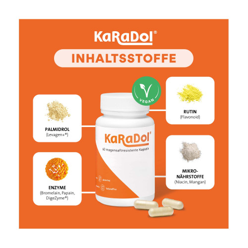 KaRaDol® kombiniert einen Enzymkomplex mit Palmitoylethanolamid (PEA, Palmidrol), Rutin und den Mikronährstoffen Niacin und Mangan.