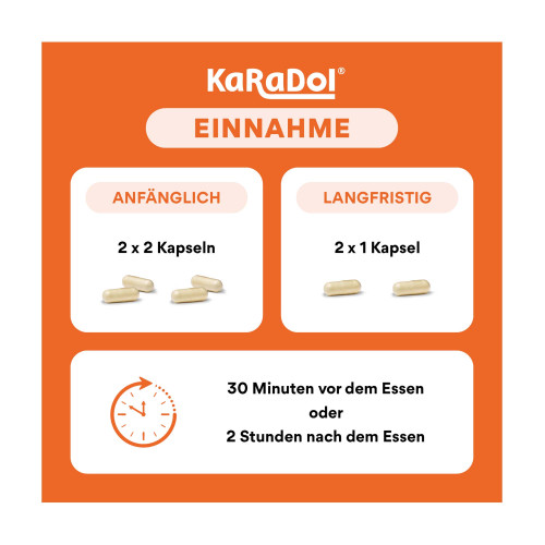 Das Schmerzempfinden ist unterschiedlich stark ausgeprägt. Nach wissenschaftlichen Erkenntnissen stellen sich die optimalen Effekte bei regelmäßiger Anwendung von KaRaDol® nach 2-4 Wochen ein. Die Tagesdosis kann bei gutem Ansprechen auf 2 x täglich 1 Kapsel reduziert werden. KaRaDol® ist für die Langzeiteinnahme geeignet.
